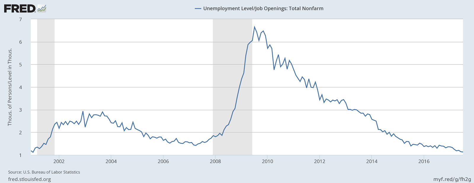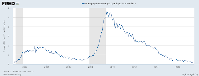 Just to check, we can look at another measure, which is a measure of labor market tightness (or it's inverse, as conventionally measured in the labor literature). This is the ratio of the number of unemployed to total job openings: Shortly after the last recession ended, this measure peaked at about 6.6 unemployed people per job opening, and it's now down to close to 1 unemployed person per job opening. Indeed, that's close to the lowest reading since the BLS started collecting this particular job vacancy data. So, by conventional measures the job market is very tight, which should be viewed as extremely good performance on the Fed's part.