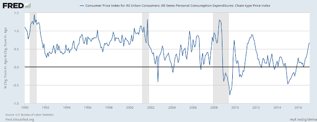 1. "...inflation at the rate of 2 percent, as measured by the annual change in the price index for personal consumption expenditures, is most consistent over the longer run with the Federal Reserve’s statutory mandate." Note that the price index the Fed has chosen as most appropriate is the raw, headline pce deflator, not the pce deflator stripping out food and energy, the cpi, the core cpi, or any other measure. So we should hold them to that choice. Here's year-over-year inflation rates, since the last recession: Obviously the Fed hasn't been hitting 2% inflation spot on, but what's actually feasible, or even desirable? The Bank of Canada, to take an example that's close at hand for me, actually sets a target band of 1-3% for inflation, so by that criterion the Fed has done pretty well - within the 1-3% band for most of the last seven years, except during 2015 after the fall in energy prices, which perhaps is understandable. The current inflation rate is 1.4%, which is tolerably close to the Fed's ideal. But the the Fed also has a "symmetric inflation goal." Missing the target sometimes is OK, but the FOMC would like to miss on the high side about as much as it misses on the low side - roughly, average inflation should be close to 2%. Over the last year, inflation was above 2% for two months, and below for 10 months, with an average of 1.6%. Not quite symmetric, but not so bad.