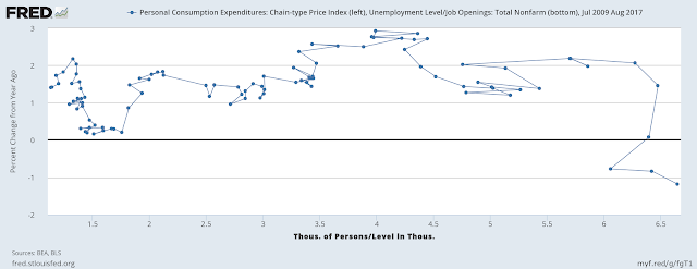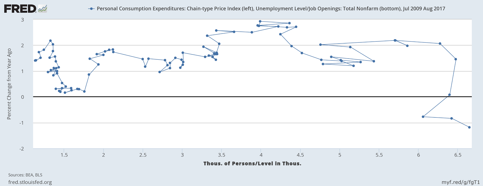 The Phillips curve is at most barely present in data for the past 25 years.For example, in the recent post-recession period, here's what we get when we plot inflation against the measure of labor market tightness I used above (ratio of unemployed to job seekers): The line connects the observations in temporal sequence from right to left. Over this period of time, I think the Fed would claim that inflation expectations are more or less "anchored." So, what we should see in the chart, if the Phillips curve is to be at all useful, is a set of observations tracing out a downward-sloping relationship. But, more often than not, inflation and my "slackness" measure are moving in the same direction. There's nothing new about macroeconomists raising issues with the Phillips curve as a cornerstone for policy. It's been in disrepute for much of the last 45 years or so, both on theoretical and empirical grounds. Unfortunately, the Phillips curve was dragged out of the gutter, dressed up, and rehabilitated by New Keynesians, which is another story altogether.