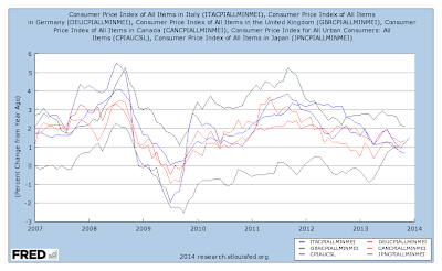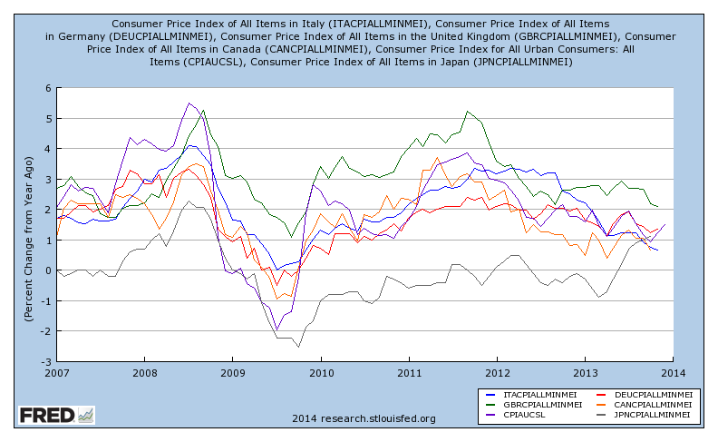 As I have stated before, (here and here), for the U.S., the current policy stance is a trap. The Fed clearly intends to maintain its policy interest rate target at essentially zero, possibly well into 2016. But, particularly as the economy continues to strengthen, most forces are pushing short-term real rates of return up. With short-term nominal rates of return pegged at zero by the central bank, the inflation rate has nowhere to go but down. But central bankers appear only to understand the short-term liquidity effects of central bank actions. They seem to think that a low short-term nominal interest rate must mean high inflation, even if the nominal interest rate is persistently low. Though real rates of interest are certainly not constant, and there can be persistence in deviations of real rates of interest from long-run averages, if the short term nominal interest rate is low for a long period of time, then the inflation rate is guaranteed to be low.